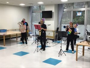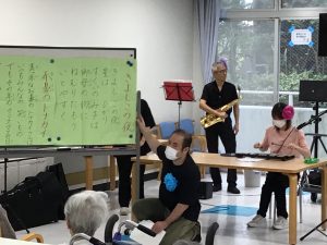 サックスやトランペット、ユーフォニウムなど音の大きな楽器をメインに、会場は大盛り上がり(^^♪。入所者様も打楽器や手拍子で一緒にノリノリに!活気と笑顔にあふれました。